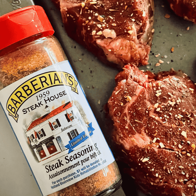 Barberian’s Steak Seasoning comes from the famous Barberian’s Steak House in Toronto, ON, who created this recipe in 1959. A complex blend of more than a dozen ingredients including sea salts, garlic, onion, a blend of fine herbs and spices, cane sugar, garlic & onion, but low in sodium and without preservatives or MSG, Harry’s famous seasoning has been often imitated but never duplicated. It’s a Canadian steak-house legend in a bottle and a staple we’ve carried in our shop for decades!